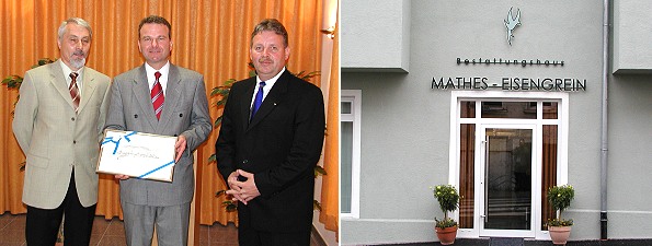 Bestattungshaus Mathes-Eisengrein eröffnete Filiale in Eberbach V.l.: Gerhard Eisengrein, Bernhard Martin und Rolf Mathes bei der gestrigen Eröffnung. (Fotos:Claussen)(jc) "Dem Leben einen würdigen Abschluss geben" ist der Leitgedanke der gestern in der Odenwaldstraße 2 offiziell eröffneten Filiale des Bestattungshauses Mathes–Eisengrein. Eberbach ist neben Hirschhorn, Neckarsteinach und Schönau der vierte Standort des 1986 von den beiden selbständigen Handwerksmeistern Gerhard Eisengrein und Rolf Mathes gegründeten Hauses.