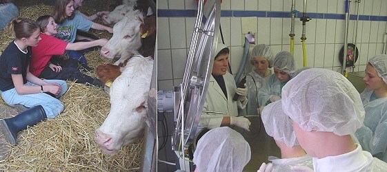 Eine Woche später drehte sich dann alles um die Milch als Grundprodukt der Käseherstellung. Besonderes Interesse kam dabei natürlich den Milchkühen zu, die noch zu den glücklichen Kühen gehören, die den Tag im Freien auf der Weide verbringen dürfen. So mussten die Kühe zum Melken dann auch erst in den Stall gebracht werden. Im Melkstand konnten die Jugendlichen dann beim Melken der 25 Kühe tatkräftig mithelfen und eine Vielzahl von Fragen loswerden.
