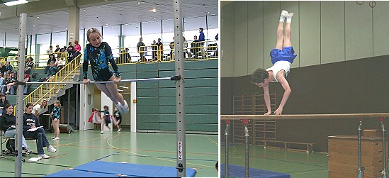 Vereinsmeisterschaften 2004 Die Fotos zeigen Tamina Dengel am Reck und Tino Broghammer beim Barrenabgang (v.l.). (Fotos:privat)(bro) Am Samstag, 8. Mai, ermittelten die Turnerinnen und Turner des TV 1846 Eberbach in der Ittertal-Sporthalle ihre Vereinsmeister. Geturnt wurde in zwei Durchgängen, zunächst in der Allgemeinen Klasse, wo die Kleinen auch ihre Spielturnabzeichen bzw. Kinderturnabzeichen erwarben. Später zeigten dann die Jungen und Mädchen der Fördergruppe ihr Können an den Geräten.