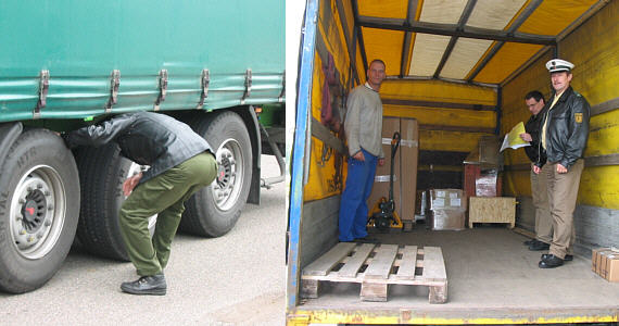 Bundesweite Kontrollen des LKW-Verkehrs auch in Eberbach Ein Polizist inspiziert die Bereifung (l.), Polizeibeamte bei der Prüfung des Laderaums. (Fotos:Polizeirevier Eberbach)(lct) (pol) Die Verkehrspolizei Heidelberg und das Polizeirevier Eberbach beteiligten sich mit starkem Personaleinsatz an den heute bundesweit stattfindenden LKW-Kontrollen.