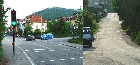 Stadt will in sichere Schulwege investieren - Appell an Verantwortung der Eltern Auf der Prioritätenliste: die Kreuzung Beckstraße / Schwanheimer Straße und der Gehwegausbau in der Alten Dielbacher Straße. (Fotos:Richter)(hr) Seit Herbst 2000, nach dem tödlichen Unfall eines neunjährigen Jungen auf der Schwanheimer Straße, erarbeitete die Stadt Eberbach einen Schulwegeplan, in dem sie Konfliktpunkte im Fahrzeug- und Fußgängerverkehr erhob und Vorschläge zu deren Lösung erarbeitete. Beteiligt waren neben einem Karlsruher Ingenieurbüro, Behörden, Schulen, Kindergärten und Elternbeiräten auch die Eberbacher Bürgerinnen und Bürger, die zahlreiche Anregungen beisteuerten. Im November 2003 wurde der Entwurf des Schulwegeplans der Öffentlichkeit vorgestellt (wir berichteten). Jetzt ist das Werk fertig, und der Gemeinderat hat den Plan heute anerkannt.