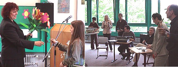 Die Klassen 9b und 9c überraschten mit einem Patchwork-Wandteppich, der von den Schülern aus vielen Einzelteilen zusammengesetzt wurde mit dem Wunsch, dass im gemeinsamen Schulleben Licht und Schatten im ausgewogenen Verhältnis stehen. Die Klasse 5b überreichte der Leiterin Blumen in haltbarer Form mit guten Wünschen. Das Kollegium stellte anhand von rhythmischen Geräuschen mit Zeitung, Papierkorb, Schreibmaschine und anderen Schulutensilien ein Klangbild dar, auf dass man immer einen gemeinsamen Rhythmus finden möge.