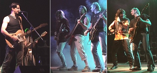 Das Dynamit zündete nicht - Superjones überzeugten Links Superjones-Frontmann Kevin Jones und Bassist Tobias Christ. Mitte und rechts "Dynamite". (Fotos:Richter)(hr) Unter Besuchermangel litt gestern Abend das Rock-Konzert der beiden Bands "Superjones" und "Dynamite" in der Eberbacher Stadthalle.