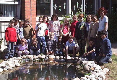 Die Lehrerin, die schon mit ehemaligen Klassen den Schulgarten neben dem Klassenzimmer in einer Garten-AG gestaltete, brachte den Gartenteich, der bereits in früheren Jahren existiert hatte, mit ihren Helferinnen und Helfern wieder auf Vordermann. Unbürokratisch legten Schülerinnen, Schüler und die Lehrkraft einen Ganztagesschulbesuch fest. Nach dem "normalen" Unterricht stärkten sich die Hobbygärtner erst einmal mit in der Schule gekochten Nudeln und Tomatensoße. Für die baulichen Maßnahmen lieferte das städtische Bauamt die nötigen Steine und Martin Gumb, Ehemann der Klassenlehrerin und "ehrenamtlicher Pflanzberater" der Klasse 3b, unterstützte die Kinder bei ihrer Arbeit. Jetzt ist der Gartenteich fertig gestellt und in absehbarer Zeit werden Pflanzen wie Fieberklee, Muschelblume, Froschlöffel, Wasserhyazinthe und Sumpfdotterblumen den Teich optisch bereichern.