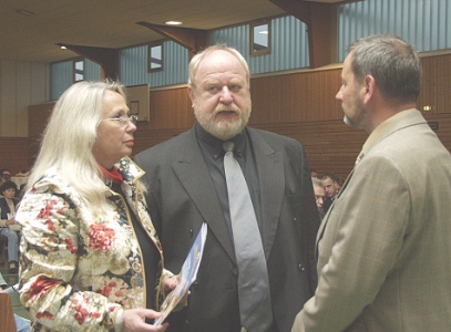 Das Märchen von der gerechten Steuer Unser Bild zeigt Günter Ederer mit Ehefrau Anke im Gespräch mit dem Volksbank-Vorstandsmitglied Friedrich Heuser.(Foto:privat)(tw) (Voba)Das Vortragsthema des national und international mit Preisen für seine Bücher und Filme überhäuften Wirtschaftsjournalisten Günter Ederer irritierte zwar, aber Vorstandsvorsitzender Herbert Hinterschitt von der Volksbank Neckartal versprach in seiner Begrüßungsrede den 300 Zuhörern in der Wiesenbacher Biddersbachhalle knallharte Fakten und Recherchen zum Steuer- und Subventions(un)wesen in Deutschland. Ederer hielt, was Hinterschitt versprach. Mit quasi der Machete lichtete Günter Ederer den Paragraphendschungel und zeigte an Beispielen aus Deutschland, wer die Zeche zahlt und wer davon profitiert. Die Volksbank-Gäste glaubten Günter Ederers kompromisslosem Bekenntnis zu einer freiheitlichen Welt- und Wirtschaftsordnung, nicht zuletzt weil er in den 60 Staaten, in denen er bisher arbeitete, hautnah erlebte, dass nur Freiheit den Frieden und Fortschritt sichern kann. Ederer stellte die Frage: Warum muss der Wagen erst an die Wand gefahren werden, bis die Politik reagiert? Deutschland, so Ederer, könne sich an vielen Vorbildern orientieren, die ihre Hausaufgaben mit Bravour meisterten, wie England oder Neuseeland, das den Schritt totaler Reformen und die Abschaffung aller Subventionen wagte - und mit Vollbeschäftigung und positiven Haushaltsabschlüssen belohnt wurde. Günter Ederer appellierte an die Politiker, sich wieder an den früheren Wirtschaftsminister Ludwig Ehrhard und die soziale Marktwirtschaft zu erinnern. Wer dessen Lehren umsetze, sei erfolgreich. Ederer erinnerte daran, dass der Staat bereits heute ein Viertel des Haushalts wegen der Schuldenlast an Zinsen zahlen müsse. Ein Staat ohne Steuereinnahmen sei ein unfreier Staat. Er bekannte sich deshalb zur Steuer, nicht aber zum deutschen Steuersystem mit seinem Chaos an 70.000 Verordnungen und 300 Gesetzen.