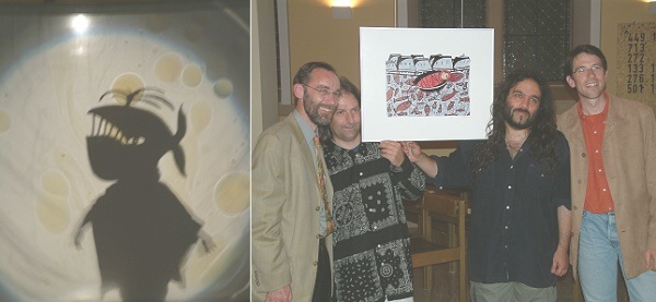 Schattentheater mit Orgelbegleitung bei der Vernissage in der Michaelskirche Eine Sequenz aus "Creation–Dream". V.l. Pfarrer Ekkehard Leytz, Martin Fuchs, Mehrdad Zaeri und Achim Plagge. (Fotos:Wörner)(tw) Mit "Creation - Dream", einer Schattentheaterimprovisation, wurde gestern Abend in der Michaelskirche die Ausstellung des Künstlers Mehrdad Zaeri "Visionen - Bilder zum Alten Testament" eröffnet. In der Einführung, die Pfarrer Ekkehard Leytz als Gespräch mit den beteiligten Künstlern gestaltete, erfuhren die zahlreichen Gäste mehr über den ausstellenden Künstler und sein Schaffen. "Mehrdad", der seit 18 Jahren in Deutschland lebt, war wie er erzählte im iranischen Isfahan mit Geschichten aus dem Alten Testament aufgewachsen. Diese Geschichten sind durchaus auch Elemente der Islamischen Kultur und Religion. Nach einer Auftragsarbeit mit 20 Bildern zum Neuen Testament, das er sich erst erschließen musste, für eine Kirche in Norddeutschland sei er auf die Idee gekommen sich für einige Arbeiten von Geschichten aus seiner Jugend über das Alte Testament inspirieren zu lassen. Nach der Technik in der seine Arbeiten entstehen gefragt, erklärte der Künstler, er habe sich vor zwölf Jahren von Öl- und Aquarelltechniken getrennt. Seither arbeite er mit Papier, Bleistift, Tusche, Copic-Stiften und sehe sich auch als Zeichner und Grafiker. "Mehrdads" Nähe zu Eberbach begründet sich unter anderem in seiner Mitarbeit beim Fex-Theater Eberbach wie Martin Fuchs erzählte. Man habe sich vor einigen Jahren beim Figurentheater "Marinaua" in Heidelberg kennen gelernt und seither immer wieder zusammen gearbeitet.