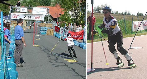 Über 100 Teilnehmer bei Inliner- Wettbewerben Ganz schön steil ging es beim Inliner-Slalom in Waldkatzenbach herunter. Auch wurden große Geschwindigkeiten erreicht. (Fotos:Baumgartner)(tb) Als zweites sportliches Event der Waldkatzenbacher 600-Jahr-Feier fanden am Samstag auch zwei alpine Ski Inliner-Wettbewerbe statt. Veranstalter waren dabei die Skizunft Katzenbuckel Eberbach in Zusammenarbeit mit dem Skiclub Mosbach.
