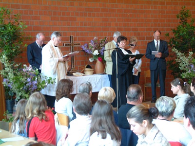 Gottesdienst musste dieses Jahr im Evangelischen Gemeindehaus gefeiert werden Pfarrer Hubert Seitz und Dekanin Hiltrud Schneider-Cimbal hielten den Gottesdienst im Evangelischen Gemeindehaus. (Foto:privat)(tw) (mr) Seit nunmehr fünf Jahren wird in Eberbach der "Tag der Ökumene" gefeiert - ein gemeinsamer Pfingstgottesdienst katholischer und evangelischer Christen. Dieses Mal aber nicht in gewohnter Weise auf dem Leopoldsplatz, die Gemeinde musste wegen des schlechten Wetters in das Gemeindehaus umziehen. Im überfüllten Gemeindehaus hielten Pfarrer Hubert Seitz und Dekanin Hiltrud Schneider-Cimbal den festlichen Pfingstgottesdienst, der vom evangelischen Posaunenchor musikalisch begleitet wurde.