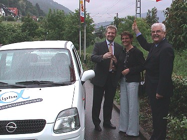 Auto-Spende von DGF Stoess für die Sozialstation Dr.Peter Pfeilschifter bei der Schlüsselübergabe an Karin Hemberger, rechts Dr.Gerhard Brunn. (Foto:C.Richter)(hr) (cr) Die Sozialstation Eberbach feiert dieser Tage ihr 25-jähriges Bestehen. Aus diesem Anlass fand heute ein Benefizessen im Gasthaus Kühler Krug in Eberbach statt.