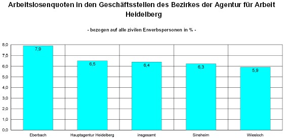 Arbeitslosigkeit geht im Mai weiter zurück - Eberbach bleibt trauriger Spitzenreiter (Grafik:Agentur für Arbeit)(hr) (aa) Im Mai hat sich die Erwerbslosigkeit im Bezirk der Agentur für Arbeit in Heidelberg mit den Geschäftsstellen in Eberbach, Sinsheim und Wiesloch weiter verringert. Am Monatsende waren 13.770 Männer und Frauen ohne Beschäftigung, 305 weniger als im April. Die Arbeitslosenquote, gemessen an allen Erwerbspersonen, ging von 6,5 auf 6,4 Prozent zurück. So erfreulich diese Entwicklung auch ist, gänzlich zufrieden zeigte sich der Leiter der Heidelberger Agentur für Arbeit, Wolfgang Heckmann, nicht. "Die Besserung ging nicht über das jahreszeitlich übliche Maß hinaus. Auch die Hoffnung, dass die Arbeitslosigkeit unter das Vorjahresniveau sinkt, erfüllte sich nicht. Die wirtschaftliche Dynamik muss noch erheblich an Kraft gewinnen, um den Arbeitsmarkt mitzuziehen".