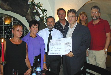 2200 Euro für Musiktalente Vorgestern im Alten Badhaus: Hans Beier von "Kabine 4" überreicht den Spendenscheck über 2200 Euro an Wolfgang Köhler (3.v.l.) im Beisein von Helga Köhler (l.), daneben ihre Schwägerin Karla Köhler sowie die Stiftungs-Beiratsmitglieder Willi Haas (Mitte hinten) und Dieter Uhrig (r.) sowie Sonja Perbandt. (Foto:Geesey)(hr) (Quelle:Eberb.Ztg.) Für "Kabine 4" war die Veranstaltung des Benefiz-Konzerts "Come together" ein Großprojekt, das sie mit Unterstützung der Bürgerstiftung erfolgreich bewältigte (wir berichteten). Der Aufwand hat sich gelohnt: Vorgestern übergab Band-Mitglied Hans Beier den Scheck über 2200 Euro für den Norbert-Köhler-Musikpreis an Wolfgang Köhler, Bruder und Stiftungsbeirat, der eigens aus Kelkheim bei Frankfurt nach Eberbach gekommen war.