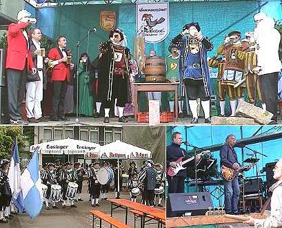 Heute und morgen wird närrisches Stadtjubiläum gefeiert Ein Hoch auf 777 Jahre Eberbach bei der Festeröffnung heute Vormittag. Unten der Fanfarenzug und die Band "Dileit". (Fotos:Richter)(hr) Ein zumindest für die Jahreszeit außergewöhnlicher Festakt fand heute Vormittag auf dem Leopoldsplatz statt, war er doch karnevalistischer Natur: Die Eberbacher Narrenschar nahm die 777 Jahre zurückliegende Ersterwähnung der Stadt zum Anlass für ein zweitägiges Jubiläumsfest. Organisiert wurde es gemeinschaftlich von den Karnevalgesellschaften Kuckuck (Eberbach), Urmel (Neckarwimmersbach) und Club Eulenspiegel (Rockenau). In närrischer Laune zeigte sich heute auch das Wetter. Strömender Regen und Sonnenschein bei eher herbstlichen Temperaturen wechselten sich ab und waren wohl auch verantwortlich für den spärlichen Besucherandrang auf dem mit viel Aufwand ausstaffierten Leopoldsplatz.