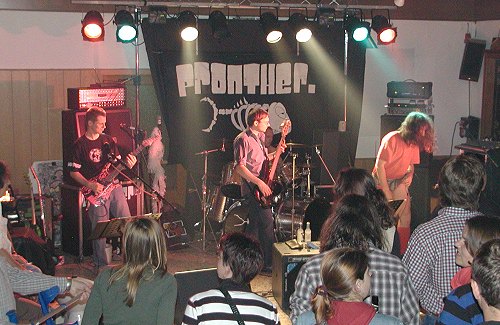 Kein Open-Air-Wetter in Kailbach Die "Bresslufd" riss ihre eingefleischten Fans wie immer mit (Foto:Claussen)(jc) Die gestrige Ittertal- Open-Air- Veranstaltung auf dem Sportgelände in Kailbach war komplett von den derzeitigen Wetterkapriolen geprägt. Seit Tagen hatte sich schlechtes Wetter abgezeichnet, so war es auch keine große Überraschung, dass man die Aufbauarbeiten bei Regen durchführen musste. Als Bühne sollte ein Lkw- Anhänger dienen. Als beim stärker werdendem Regen das Equipment nass wurde, entschloss man sich die Veranstaltung im ISV-Clubhaus abzuhalten. Just zu Beginn war es dann mit dem Regen vorbei, aber zahlreiche Open-Air-Fans, die angesichts der angesagten odenwälder Bands sicherlich ins Ittertal gekommen wären hatte es die Lust für Freiluft- Konzerte offensichtlich bereits verhagelt. So gaben die Bands "Blond" aus Haingrund, Bresslufd aus Gammelsbach und die "hartblondierten" Headliner "Pronther" zwar alles, aber der Besuch ließ am Ende doch etwas zu wünschen übrig, was zwangsläufig etwas auf die Stimmung drückte. Die eingefleischten Fans kamen aber trotz allem auf ihre Kosten.