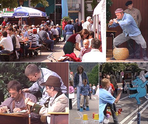 777 Jahre Eberbach - am Ende doch noch ein rundes Fest Viel Betrieb herrschte auf dem Leopoldsplatz. Oben rechts Josef Nemeth von den "Odenwälder Bauern" als Schlangenbeschwörer, unten das Laientheater und die Kinderspiele. (Fotos:Richter)