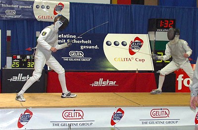 Deutsche B-Jugendmeisterschaften um den 4. GELITA CH alpha®-Cup Gefechtszene (Foto:Veranstalter)(jc) Mit 132 Fechtern war am vergangenen Wochenende das Starterfeld für die Deutsche Einzelmeisterschaft der B-Jugend im Herrenflorett der Jahrgänge 1991 und 1990 in der Pattberghalle in Neckarelz komplett. Jeweils 66 Teilnehmer starteten nach Nominierung durch ihre Verbände je Jahrgang. Für die jüngsten Fechter war diese Deutsche Meisterschaft um den 4. GELITA CH alpha®-Cup ein erster nationaler Höhepunkt in ihrer Fechterkarriere. Mit viel Mühe und der Hilfe des Eberbacher Sponsors GELITA hatte der Fecht-Club Mosbach die Halle am Freitagabend hergerichtet um die Voraussetzungen für einen harmonischen Ablauf zu schaffen.