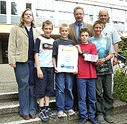 (bro) (hsg/ro) Seit drei Jahren haben Schüler der 6. und 7. Klassen des HSG in enger Zusammenarbeit mit dem Umweltamt der Stadt Eberbach eine Bachpatenschaft für den Pleutersbach übernommen. Dabei pflegen und untersuchen sie das Gewässer regelmäßig. Diese Arbeit wurde jetzt in Form einer PC-Präsentation mit Videoausschnitten unter dem Titel "GHOST BACH STARS" dokumentiert und als Beitrag zum Wettbewerb "Wasser ist Leben" der Peterstaler Mineralquellen GmbH eingesandt. Unter dem diesjährigen Motto "Wasser ist Spaß" hatten 700 Schülerinnen und Schüler aus Baden-Württemberg ihre Beiträge eingeschickt. Der Beitrag des HSG wurde hierbei von der Jury mit einem 3. Preis bewertet. Am vergangenen Donnerstag wurden den glücklichen Siegern die Urkunden im Rahmen einer Pressekonferenz auf der Landesgartenschau in Kehl durch Staatssekretär Helmut Rau, MdL, und Herrn Günther Huber, Geschäftsführer der Peterstaler Mineralquellen, überreicht. Die gewonnenen 500 Euro wollen die Bachpaten ihrem Pleutersbach für verschiedene Projekte zukommen lassen.