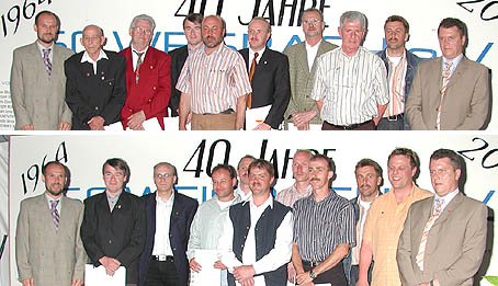 Sportplatz war Hauptbestandteil in der Vereinsgeschichte Beim Festbankett des SC Weisbach gab es auch Ehrungen seitens des Badischen Fußballverbandes. Unsere Fotos zeigen oben die mit der Verbandsehrennadel geehrten, unten die mit der Spielerehrennadel in Bronze geehrten Mitglieder des SC Weisbach zusammen mit Vorstand Manfred Schmitt (r.) und Rainer Braun (l.) vom Fußballkreis Mosbach. (Fotos:Baumgartner)(tb) Sein 40-jähriges Bestehen feiert dieses Wochenende der SC Weisbach im Festzelt am vereinseigenen Sportheim. Am 16. April 1964 wurde des SC Weisbach mit 77 Mitgliedern im Gasthaus Jägerheim mit dem Vorstand Adam Lenz gegründet, sagte beim Rückblick der 1. Vorsitzende Manfred Schmitt. Wie ein Faden durch die Geschichte des Vereins zogen sich die Probleme mit dem Sportplatz. Sportliche Erfolge hatte man mit dem Aufstieg in die A-Klasse und die Bezirksliga im Jahr 1993 zu verzeichnen.