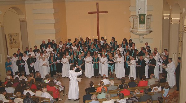 Gemeinsames Konzert des Ephrata Cloister Chorus und der Riverside Gospel Singers "Gather at the river" (Zusammenkunft am Fluss) war Höhepunkt und Abschlusslied des gemeinsamen Auftritts der beiden Chöre und wurde von Daryl Hollinger, dem Dirigenten des Ephrata Kloster-Sängerchors dirigiert. (Foto:Wörner)(tw) Gestern Abend gastierte der Ephrata Kloster-Sängerchor im Rahmen seiner Konzertour durch Deutschland, die Schweiz und Frankreich in Eberbach und gab zusammen mit den befreundeten Riverside Gospel Singers aus Eberbach ein Konzert in der Michaelskirche.