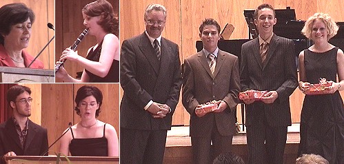 Als RABInson auf zu neuen Ufern Großes Bild: Schulleiter Helmut Schultz (l.) mit den drei Spitzenabiturienten Johannes Eisenlohr (2.v.r.), Anne Zeber und Michael Weber. Links oben Dr.Christa Blanke, Klarinettistin Julia Keßler, darunter Abi-Sprecher Christel Nelius und Stefan Volk. (Fotos:Richter)(hr) Ihren Abschied von der Schulzeit feierten heute Abend im offiziellen Rahmen die 83 Abiturientinnen und Abiturienten des Jahrgangs 2004 am Hohenstaufen-Gymnasium. Schulleiter Helmut Schultz konnte dazu in der Stadthalle zahlreiche Ehrengäste begrüßen, darunter Bürgermeister aus Eberbach und den Umlandgemeinden, Gemeinderatsmitglieder und Vertreter der Wirtschaft, Gesellschaft und Eberbacher Schulen.