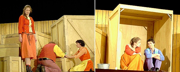 Dieses trübte die Stimmung kaum, denn den Schauspielern gelang es sehr schnell, die ca. 130 Zuschauer in eine die wilde und spannende Welt zu entführen. Für manche Kinder war es sogar so spannend, dass sie den Schoß ihrer Mütter aufsuchten. Das Stück, das aus einem Akt bestand, war aber auch mit witzigen und komischen Szenen gespickt. Das Bühnenbild bestand aus unterschiedlich großen Kisten, die je nach Bedarf den Wald oder die Burg darstellten.