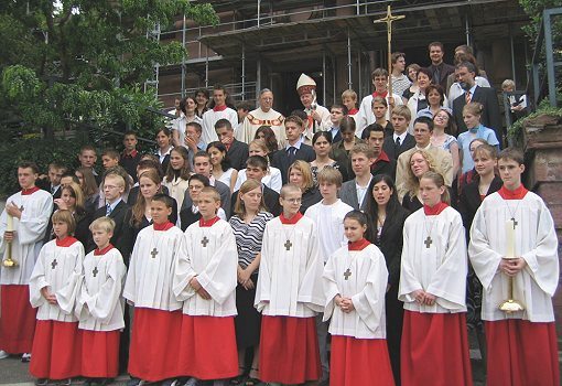 Firmgottesdienst in St. Johannes Nepomuk mit Bischof Emil Stehle (Foto:privat)(tw) (bs) "Kirche - Wir kommen" Unter diesem Motto stand der Firmgottesdienst der 42 Firmanden, die am gestrigen Sonntag durch Bischof Emil Stehle das Sakrament der Firmung empfingen. Firmung bedeutet in der Katholischen Kirche Stärkung und wird durch Handauflegung, die Salbung mit Chrisam und einem Gebet vollzogen. Der Firmand bekennt sich in diesem Sakrament eigenständig zum katholischen Glauben. Der Firmkurs dauerte seit Oktober letzten Jahres und wurde von ehrenamtlichen GruppenbegleiterInnen geführt. In zahlreichen Praktika hatten die Firmanden die Möglichkeit das Gemeindeleben der beiden Eberbacher katholischen Gemeinden kennenzulernen. Ein Höhepunkt war das einwöchige Kompaktseminar in den Pfingstferien. Die Jugendlichen bereiteten sich intensiv auf dieses Ereignis vor, auch der Gottesdienst wurde von ihnen zentral mitgestaltet. Bischof Stehle, der sich viel Zeit nahm und mit jedem Firmanden einige persönliche Worte wechselte, sprach den Wunsch und die Hoffnung aus, dass sich viele auch über den Firmgottesdienst hinaus von Gottes Geist anstecken lassen und sich in Zukunft für die Gemeinde begeistern können.