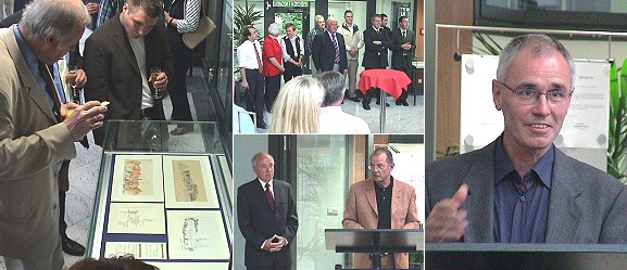 Persönliche Reise-Eindrücke mit Architekten-Blick Achim Fiedler (rechtes Bild) stellt in der Sparkasse aus. Mitte unten Direktor Wolfgang Kleeberger (l.) und Bruno Schmitt bei der Ausstellungseröffnung. (Fotos:Richter)(hr) Freihand-Zeichnungen und Reise-Skizzen von Achim Fiedler sind seit gestern in der Schalterhalle der Sparkasse Neckartal-Odenwald in Eberbach zu sehen. Bei der Eröffnung der Ausstellung gestern Abend erläuterte Bruno Schmitt nach der Begrüßung durch Sparkassen-Direktor Wolfgang Kleeberger und beschwingtem Jazz von den "Living Standards" die in fünf Glasvitrinen präsentierten Werke.