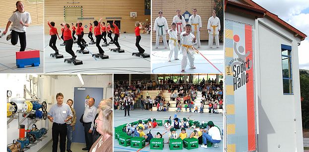 Tag der Sportvereine in der neuen Hohenstaufen- Sporthalle (Fotos:Claussen)(jc) Beim "Tag der Sportvereine" nahm heute eine breite Öffentlichkeit die neue Hohenstaufen- Sporthalle unter die Lupe. Sportvereine aus Eberbach und Umgebung vermittelten in der mit Vorhängen abtrennbaren Drei-Feld-Halle, am Beispiel ihrer Sportarten, einen Einblick in die Nutzungsmöglichkeiten des fast sieben Millionen Euro teuren Bauwerks. Die Bevölkerung nahm auch das Angebot, sich mit Führungen durch die funktionell ausgestattete Halle mit einer Nutzfläche von 3600 Quadratmetern zu informieren, zahlreich in Anspruch. Für technisch Interessierte gab es spezielle Führungen. Hierbei konnte man unter anderem etwas über die Solaranlage zur Brauchwassererwärmung oder die zur Wärmerückgewinnung ausgelegte Lüftungsanlage erfahren. Mit Details, wie Pissoirs ohne Wasserspülung und "Lotusblüteneffekt", gab es für die Besucher sogar absolut Unerwartetes zu Bestaunen. In der großen Halle, die mit ihrer Tribünenanlage 500 Zuschauern Platz bietet, stehen Handball-, Volleyball-, Basketball- und Badminton- Felder zur Verfügung. Als Besonderheit es hier auch eine acht Meter hohe künstliche Kletterwand. In einer vierten Übungseinheit im Untergeschoss, mit einer Fläche von 27 mal 14,5 Metern, ist kein Ballsport vorgesehen. Schwenkbare Kletter- Anlagen und eine 7,5 Meter breite Folienspiegelwand erlauben aber trotzdem eine vielfältige Nutzung. Für den späteren Ausbau sind drei weitere Übungseinheiten auf dieser Ebene vorgesehen.