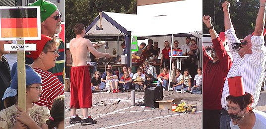 Olympia auf dem Jahnplatz Eine Olympiade (rechts die "Türkei" im Siegestaumel) und Jongleur "Jeremy" zählten zu den Highlights beim KGK-Sommerfest. (Fotos:Richter)(hr) Dem Thema "Griechenland" widmete die Karnevalgesellschaft Kuckuck gestern ihr Sommerfest am "Kuckucksnest" auf dem Jahnplatz. Unter der organisatorischen Leitung der KGK-Jugend war nicht nur die Bewirtung ganz auf griechische Spezialitäten abgestimmt bis hin zur brandaktuellen "Rehakles-Platte". Passend zum sportlichen Großereignis in diesem Sommer in Athen gab es auch auf dem Jahnplatz eine "Olympiade": Teams aus Deutschland, Frankreich, Schottland, USA und Türkei massen sich in allerlei Geschicklichtkeitsspielen und Wettkämpfen, bei denen sich die "türkischen" Athleten schließlich als siegreich erwiesen.