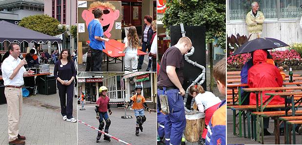 Nach zwei Stunden war Schluss - Sicherheitsrisiko zu groß Links: "Schirmherr" Bürgermeister Bernhard Martin mit Claudia Hülsen bei der Eröffnung. Am Ende musste aber jeder selbst für den Schirm sorgen (rechts). (Fotos:Claussen)(jc) Heute, pünktlich um 15 Uhr, gab die Vorstandsvorsitzende des Stadtjugendrings Eberbach, Claudia Hülsen, im Beisein von Schirmherr Bürgermeister Bernhard Martin den Start für den Jugendtag mit Inliner-Event frei. Dass der Begriff "Schirmherr" heute eine doppeldeutige Wortspielerei sein könnte, war beim Anblick des sommerlichen "Aprilwetterhimmels" zwar schon zu befürchten, aber es gab zunächst dennoch genügend Optimisten um einen gelungenen Jugendtag veranstalten zu können.