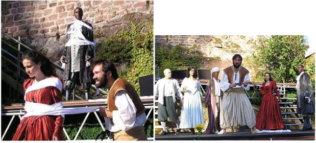 Bild rechts: Osmin (Mario Klein) im Vordergrund, hinten von links Mark Hamann (Pedrillo), Arndis Halla (Blonde), Charles Ebert (Bassa Selim und zugleich Regisseur des Stücks), Angela Rudolf (Konstanze) und Girard Rhoden (Belmonte) (Fotos:Festspiele)(ak) "Lebendig, interessant, emotional" - so stellt sich Charles Ebert seine Inszenierung von "Die Entführung aus dem Serail" vor. Der erfahrene Regisseur bringt das Mozart-Singspiel bei den diesjährigen Schlossfestspielen in Zwingenberg auf die Bühne. Premiere ist am 7. August.