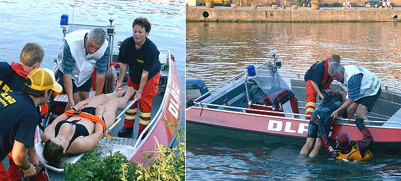 Der vierte Surfer trieb laut Übungsanweisung unter dem überhängenden Gebüsch am Neckarufer beim Campingplatz. Zum Glück für den "Verletzten" war das Neckarwasser 26 Grad warm, denn das Auffinden in diesem tückischen Gestrüpp war nur mit Tauchereinsatz und einiger Geduld möglich.