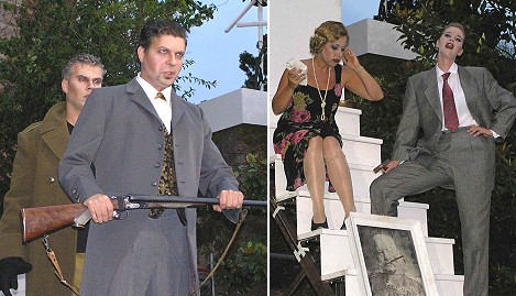 Holger Müller-Brandes inszeniert die Zwingenberger Hausoper "Umgebt ihn, ihr Geister", beschwört Kaspar (Kai-Uwe Fahnert) die bösen Mächte, und wird dabei selbst von Samiel (Holger Ehlers) bedrängt. Rechts Ännchen (Sonja Gerlach) im Marlene-Dietrich-Look, neben ihr Agathe (Kerrie Sheppard). (Fotos:Festspiele)(hr) (sb) "Den kleinen flachen Hut müssen wir uns merken, der wär’ vielleicht auch was für das Ännchen" überlegt Regisseur Holger Müller-Brandes. Wie bei einer Modenschau probieren die Chorsänger in der Eberbacher Schule eine Auswahl von Kostümen durch. Dabei beäugen sie vorsichtig den Mann, der in diesem Jahr ihre "Hausoper", Carl Maria von Webers "Der Freischütz", bei den Schlossfestspielen Zwingenberg auf die Bühne bringen wird.