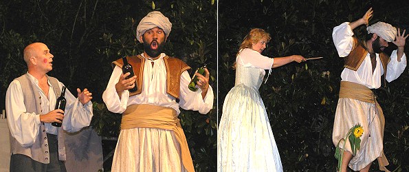 Bild links: Mark Hamman (Pedrillo, links) und Mario Klein (Osmin) beim Loblied auf Gott Bacchus, Bild rechts: Eine der zahlreichen kecken Attacken von Blonde (Arndis Halla) auf den Wüterich Osmin (Mario Klein). (Fotos:Festspiele)(ak) Anhaltend heftige Regenfälle veranlassten die Organisatoren der Schlossfestspiele Zwingenberg, die Premiere von Mozarts "Die Entführung aus dem Serail" gestern Abend in die Stadthalle Eberbach zu verlegen. Intendant Prof. Dr. Friedemann Eichhorn bedankte sich bei Bürgermeister Bernhard Martin, der die Stadthalle so problemlos zur Verfügung gestellt hatte. Er versprach nicht zu viel, als er dem Publikum versicherte, dass alle Beteiligten ihr Bestes geben würden - allen voran die Künstler - um den Abend gelingen zu lassen. Mit reichlich organisatorischem Geschick war es gelungen, die rund 650 Zuhörerinnen und Zuhörer unterzubringen, nachdem allerhand Requisiten, Instrumente und Kostüme von Zwingenberg herangeschafft worden waren. Einzig die Organisatoren der Getränkeversorgung in der Pause waren der veränderten Lage nicht gewachsen - bei Preisen, die aber unverändert Schloss-Flair atmeten.