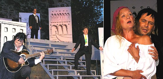 Strauß-Operette hat am Donnerstag in Zwingenberg Premiere Links Holger Ries (Caramello), Alexander Siede (Enrico) und Christian Brüggemann (Herzog), rechts Holger Ries mit Britta Wielandt (Annina). (Fotos:Festspiele)(hr) (sb) Romantisch, bunt und witzig soll die "Nacht in Venedig" werden, die am Donnerstag, 12. August, in Zwingenberg Premiere feiert. Regisseur Thomas Kiemle bringt die Strauß-Operette temporeich und komödiantisch auf die Bühne.