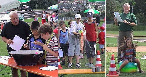 Ferienkinder durchweg polizeitauglich (Fotos:C.Richter)(cr) Eine "Tauglichkeitsprüfung" für den Polizeiberuf legten heute Mächen und Jungen im Sportzentrum in der Au im Rahmen des Eberbacher Ferienspaß´ ab. Fast schon traditionell ist der Besuch bei der Polizei in den Sommerferien. Diddi Schnüffelnase alias Dieter Jeitner und Martina Braner sorgten gemeinsam mit vier weiteren Polizeibeamten wieder für einen spannenden Nachmittag.
