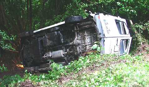 Mit Sprinter zu schnell unterwegs (Foto:Richter)(hr) Die Herrschaft über ihren Kleinbus verlor heute gegen 16.45 Uhr eine 32-jährige Fahrerin aus Michelstadt auf der B 45. Auf gerader Strecke in Richtung Beerfelden geriet der Mercedes Sprinter kurz hinter der Firma DGF Stoess auf regennasser Fahrbahn vermutlich ins Schlingern. Das Fahrzeug schoss nach links über die Straße, streifte einige Bäume und stürzte dann auf die Seite, wo es total beschädigt im Bewuchs unterhalb der Straße liegenblieb. Die Frau und ihr Beifahrer blieben unverletzt.