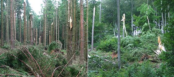 Sturm hauste im Stadtwald - Gefahren für Spaziergänger Einige der gestrigen Schäden erinnern an große Sturmkatastrophen wie "Lothar" und "Wiebke". (Fotos:Richter)(hr) In den gestrigen Gewitterstürmen rund um Eberbach müssen wohl auch einige Orkanböen mitgemischt haben. Nicht anders sind die Bilder zu erklären, die die Eberbacher Forstleute heute Morgen im Stadtwald vorfanden: Reihenweise gebrochene und geworfene Fichten und Buchen. Selbst stabilen Eichen machten die Stürme den Garaus. Zwischen 2.000 und 2.500 Festmetern schätzt die Stadtförsterei den Umfang des ungewollten Holzanfalls. Dabei stecken die Förster und Waldarbeiter eigentlich gerade noch im Kampf gegen die Borkenkäfer und können eine weitere Katastrophe gar nicht brauchen. Dass viele Bäume nicht entwurzelt sondern gebrochen wurden, macht die Sache noch schwieriger. Denn durch die gesplitterten Bruchstellen gibt es viel unverwertbaren Holzabfall. Außerdem können keine langen Stämme sondern nur kurze Stücke aufgearbeitet werden, was die Kosten nach oben treibt und auch schlechter für die Holzerlöse ist.