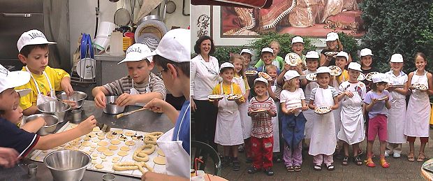 Nach einem kleinen Imbiss mit Apfelsaft und Laugenteilchen wanderte die Gruppe in die Backstube, wo sie schon vom Backstubenleiter Martin Beigel erwartet wurden. Dieser hatte bereits im Vorfeld zusammen mit Florian Strohauer-Valerius, Ramon Strohauer und Meike Bräunlein alle Vorbereitungen für die kleinen Bäcker getroffen. Die Mädchen und Jungen, in Schürzen verpackt und mit Mützen versehen, konnten gleich loslegen und ihre eigene Torte verzieren. Geknetet, ausgestochen und bepinselt wurde der Mürbeteig, der vor dem Backen mit Hagelzucker, Bund- und Schokostreusel sowie Belegkirschen oft recht üppig verschönert wurde. Auch Mürbeteig-Brezeln und andere Figuren wurden hergestellt. Die Kinder ließen ihrer Fantasie freien Lauf, und so kamen nach dem Backen die herrlichsten Dinge zum Vorschein. Gerade richtig, um damit die vorbereiteten Tortenböden zu garnieren. Nach einem weiteren Getränk im Victoria-Café durften die Kids ihre fertiggestellten Kunstwerke ebenso mit nach Hause nehmen, wie ihre "Bäckermützen".