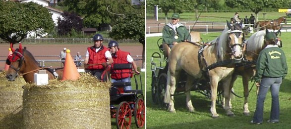 Beschränkte sich bei den Dressuren die Rolle des Beifahrers darauf, dass hübsche Damen lächelnd im Fonds sitzen durften, so ist die Aufgabe des "Copiloten" bei Hindernisfahrten ein rechter Knochenjob. Stehend muss er in halsbrecherisch engen Wendungen mit der Verlagerung seines Körpergewichts dafür sorgen, dass die Kutsche nicht aus der Kurve kippt.