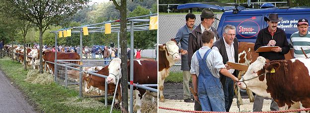 Traditionelle Prämierung von Jungvieh mit 111 Tieren (Fotos:Claussen)(jc) "Hier wird der gute Ruf der Baden- Württembergischen Landwirtschaft verteidigt", so der mit Gummistiefeln ausgerückte Bürgermeister Bernhard Martin bei der gestrigen Fleckviehrinderschau in der Au. Der traditionelle Kuckucksmarkt- Programmpunkt lockte 12 Züchter mit 111 Tieren, zwischen ein und drei Jahren alt, zur größten Jungviehprämierung innerhalb der Rinderunion Baden- Württemberg. Eine siebenköpfige Jury mit dem Leiter des Referats Tierzucht beim Landwirtschaftsamt Ilshofen, Dieter Kraft, bewertete unter anderem die altersgerechte Entwicklung und die Milchleistung der Mutter. Bei den jüngeren Tieren siegte dabei das Rind von Züchter Otto Hannegriff aus Balsbach und bei den älteren Tieren das von Matthias Rechner aus Reisenbach.