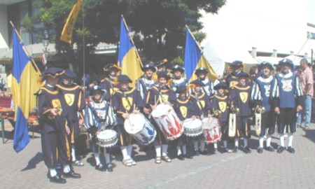Gelungene Premiere für den Eberbacher Jugendfanfarenzug Das Bild zeigt den Jugendfanfarenzug nach ihrem ersten großen Auftritt. (Foto: B. Mülller)(bm) Der vor sechs Monaten gegründete Jugendfanfarenzug der Stadt Eberbach hatte gestern seinen ersten großen Auftritt. Anlässlich des Ritterfestes in Hirschhorn konnten die 16 jugendlichen Musiker und Fahnenschwinger hier unter der Stabführung von Jochen Benkwitz zum ersten Mal ihr Bestes geben. Ermöglicht wurde dies durch eine Kooperation zwischen Fahnenschwinger, Trommler und Fanfarenbläser des Karnevalsvereins Hirschhorner Ritter und dem Fanfarenzug der Stadt Eberbach.