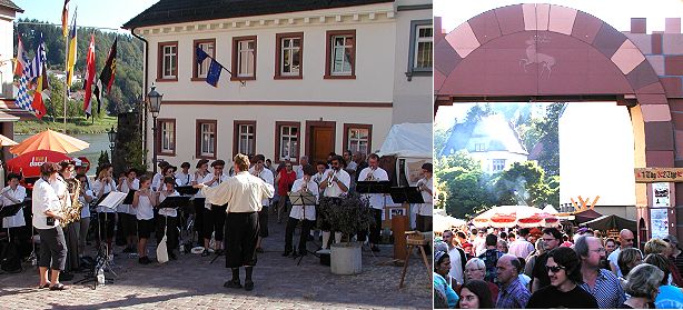 Zwei Tage mittelalterliches Treiben und Handwerk in der Altstadt Links: Konzert des Spielmannszuges Ober-Schönmattenwag, am Stadttor lauerten die freundlichen Wegelagerer (Fotos:Claussen)(jc) Gestern und heute stand Hirschhorn ganz im Zeichen des Mittelalters. Das 28. Ritterfest knüpfte damit an das 600- jährige Jubiläum der Marktrechte im Nachbarstädtchen an. Mehrere tausend Besucher ließen sich auch von brütender Hitze und einem charmant als Wegezoll deklariertem Eintrittsgeld von 3.50 Euro pro Person nicht abschrecken, das Handwerkerdorf zu besuchen. Begonnen wurden beide Tage mit einem Bürger- und Ritterzug zum Marktplatz. Die Hirschhorner Gewerbetreibenden hatten ihre Geschäfte auch am heutigen Sonntag geöffnet.