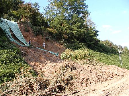 Gutachten zur Hangsanierung wird erstellt Geologische Untersuchungen am Hang (Foto:Claussen)(jc) (db) Nach dem durch einen Wasserrohrbruch verursachten Böschungsrutsch auf der Neckartalbahn (wir berichteten) bleibt die Neckartalstrecke zwischen Hirschorn und Eberbach bis auf weiteres gesperrt.Die Deutsche Bahn hat einen Gutachter mit der Untersuchung des Hangs beauftragt. Bereits am Wochenende wurden erste Untersuchungen durchgeführt. Das Gutachten mit den Vorschlägen zur Sanierung des betroffenen Streckenabschnitts soll bis Ende September vorliegen. Erst danach kann entschieden werden, wie die erforderlichen Arbeiten durchgeführt werden können.
