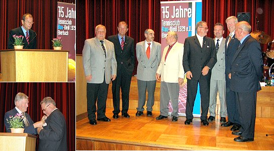 Der 1. Vorsitzenden Horst Dewald konnte als Ehrengäste und Grußwortredner Bürgermeister Bernhard Martin, das Präsidiumsmitglied Gert Kindler vom Badischen Tennisverband, den Vorsitzenden des Sportkreises Heidelberg und Vertreter des Badischen Sportbundes, Gerhard Schäfer, und Dieter Jeitner, den Vorsitzenden des Sportausschusses der Eberbacher Vereine begrüßen. Durch das Programm führte sodann der 2. Vorsitzende des TC, Thomas Schlachter. Alle Grußwortredner würdigten in ihren Ausführungen die sowohl im sportlichen wie im gesellschaftlichen Bereich geleistete Arbeit des Vereins, vor allem auch während und nach der schwierigen Kriegszeit. Bürgermeister Martin hob vor allem die immer vorzügliche Jugendarbeit des Vereins hervor und die Erfolge, mit denen die Tennisspieler die Stadt Eberbach würdig vertreten. Gert Kindler betonte in seinem Grußwort für den badischen Tennisverband vor allem die sportlichen Erfolge, die dem TC Blau-Weiss zu einem guten Namen im Badischen Tennis verholfen habe. In diesem Zusammenhang konnte er auch mitteilen, dass die Seniorenmannschaft der Herren 50+ in die Oberliga Baden aufgestiegen ist und damit das sportliche Ziel im Jubiläumsjahr erreicht hat. Auch wies er darauf hin, dass der Eberbacher Club mit seinen 75 Jahren zu den 30 ältesten der etwa 750 Tennisclubs in Baden zählt. Der Vorsitzende des Sportkreises Heidelberg, der auch die Glückwünsche des Badischen Sportbundes überbrachte, lobte das große sportliche Engagement des Vereins und die immer gute Jugendarbeit. Dieter Jeitner überbrachte die Glückwünsche aller 30 Eberbacher Sportvereine und verband damit die Wünsche für eine weitere gute Zusammenarbeit im sportlichen Bereich unserer Stadt. Auch Herr Sauermann, Vorsitzender des Nachbarclubs TC Neckar Zwingenberg, der in diesem Jahr sein 25- jähriges Bestehen feiern konnte, überbrachte als "Enkel" Glückwünsche und ein Geschenk. Geldgeschenke überbrachten auch alle anderen Grußwortredner, die vom 1. Vorsitzenden dankend entgegengenommen wurden.