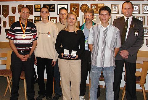 SSV Eberbach stellt Deutschen Meister und Vizemeistermannschaft V.l.: Martin Hildenbrand, Friedrich und Stephan Schölch, Katja Poser, Wulfrin Schatz, Hans Hettmansperger und Roland Johe. (Foto:Claussen)(jc) Am Dienstagabend wurden im Rahmen einer kleinen Feier im Schützenhaus die Teilnehmer des SSV Eberbach an den Deutschen Meisterschaften geehrt. Wieder einmal zeugten die in München erzielten Ergebnisse dabei von der beeindruckenden Leistungsdichte im Verein. Denn neben dem Meistertitel für Martin Hildenbrand im Luftgewehr, Altersklasse und der Vizemeisterschaft der Damen im KK 100 Meter verbuchten die Eberbacher weitere gute Platzierungen. Ohnehin beweise allein die Tatsache, dass man sich mit 11 Schützinnen und Schützen für die Deutschen Meisterschaften auf der Olympiaschießanlage in München- Hochbrück qualifizieren konnte vom hohen Leistungsstand beim SSV, würdigte der 2. Vorsitzende, Roland Johe, die Leistung der Teilnehmer.