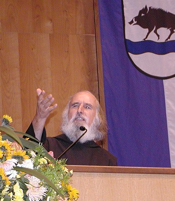 750 Besucher bei Vortragsveranstaltung der Volksbank Neckartal Pater Anselm Grün (Foto:Claussen)(jc) Gestern fand in der Stadthalle die bereits seit vier Monaten ausverkaufte Vortragsveranstaltung mit dem Betriebswirt und Doktor der Theologie, Pater Anselm Grün statt. Auf Einladung der Volksbank Neckartal referierte Pater Anselm, der als Cellar der Benediktinerabtei Münsterschwarzach in angeschlossenen Betrieben für rund 300 Mitarbeiter verantwortlich ist, zum Thema seines Buches "Menschen führen - Leben wecken" Nach der verbalen Begrüßung durch den Vorstandsvorsitzenden der Volksbank Neckartal, Herbert Hinterschitt, und einer musikalischen Begrüßung durch die "Eberbacher Akkordarbeiter" war der notwendige Boden für die ruhig und schlüssig vorgetragenen Gedanken von Anselm Grün bereitet.
