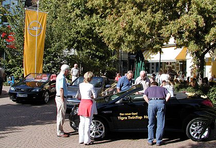 Autohaus Philipp präsentierte neues Cabrio mit Jazz, Sekt und Eis (Foto:Claussen)(jc) Der Lindenplatz war heute fest in Opel-Hand. Das Eberbacher Autohaus Philipp präsentierte bei echtem Cabrio-Wetter das neueste Modell der Rüsselsheimer, den kompakten Opel Tigra TwinTop und weitere Cabrio- Modelle. Begleitet von Jazz-Musik fanden sich zahlreiche Interessenten ein.