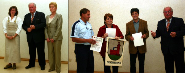 Als Anerkennung ihrer Verdienste überreichte Schilling je eine Dankesurkunde, zwei Flaschen Wein / Sekt und einen Wappenteppich der Gemeinde Schönbrunn an Ingrid Ludwig und Siegfried Heß. Herbert Kronenwett wurde mit einem eigens in Krösselbach gefertigten Wappenkrug und zwei dazugehörigen Bechern geehrt.