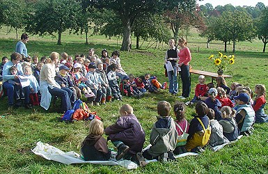 Kiga Regenbogen feierte Erntedank auf dem Bauernhof (Foto: privat)(bro) (gb) Die Kinder und Erzieherinnen des Evangelischen Kindergartens Regenbogen in Eberbach verbrachten einen erlebnisreichen Tag auf dem Breitensteiner Bauernhof bei der Bäuerin Hiltrud Rein. Früh morgens ging die Wanderung vom Kindergarten durch den Wald zum Breitenstein. Bei herrlichstem Spätsommerwetter stärkte man sich dann erst einmal mit Vesper und Trinken. Die Schulanfängerkinder gestalteten zusammen mit den beiden Anerkennungspraktikantinnen die Erntefeier, bei der dann alle mitfeierten. Auch die Fachlehrerin der beiden Praktikantinnen (Fachschule für Sozialpädagogik Mosbach) ließ es sich nicht nehmen, ihren Beobachtungs –und Beurteilungstag so zu legen, dass sie an diesem Erlebnis teilhaben konnte. Bevor es wieder zurück in den Kindergarten Regenbogen ging, besuchte man noch die Kühe auf der Weide, die Katzen und Gänse.