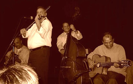 Musik deutscher Sinti von Titi Winterstein & Ensemble Titi Winterstein & Ensemble v.l.: Holzmanno Winterstein, Titi Winterstein, Banscheli Lehmann, Ziroli Winterstein (Foto:Koss)(ak) Musik deutscher Sinti der Spitzenklasse war gestern Abend in der Galerie ARTgerecht zu hören. Das Kulturlabor konnte Titi Winterstein & Ensemble für Eberbach gewinnen. Der Geiger Titi Winterstein mit bereits 32 Jahren Bühnenerfahrung entzündete zusammen mit Ziroli Winterstein als Leadgitarrist, Banscheli Lehmann am Bass und Holzmanno Winterstein an der Rhythmusgitarre ein akustisches Feuerwerk. Die Musiker fächerten ihr Repertoire frei aus Kopf und Bauch ohne Notenblätter auf. Die Elemente reichten vom Swing-Jazz von Django Reinhardt über traditionelle Zigeunermusik aus Ungarn und Russland, Swing-Valse (Musette-Improvisationen) und Bossa Nova bis zu den in der Zigeunersprache Romanes gesungenen Liedern.